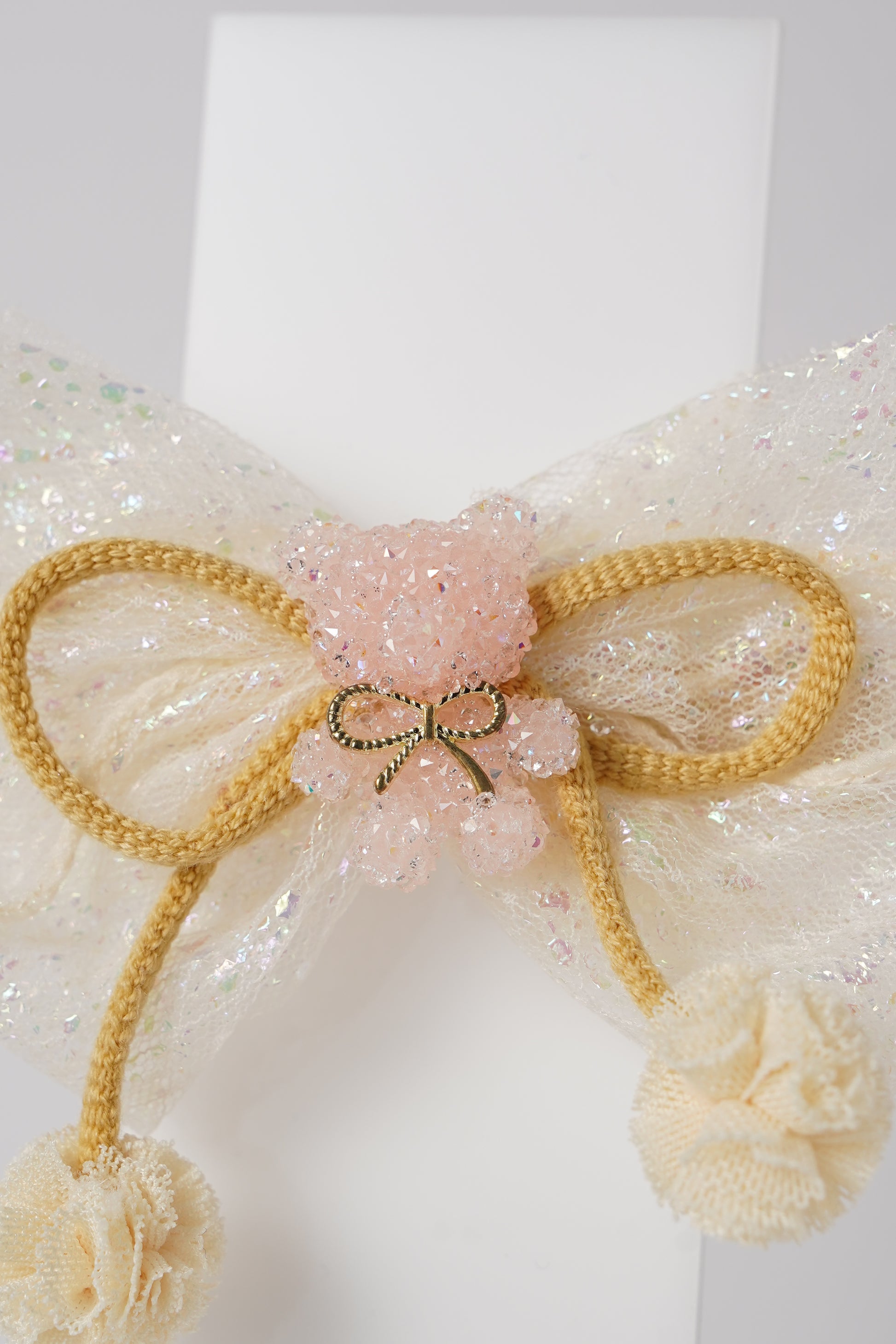 Add sparkle and charm to any hairstyle with this glittery bow hair clip featuring a pink teddy embellishment, golden rope accents, and playful pom-poms. Perfect for birthdays, parties, school events, and everyday wear, this adorable accessory makes styling fun and fashionable.